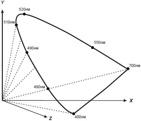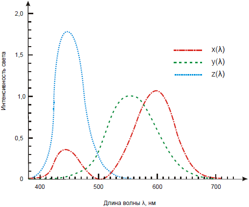 По результатам исследований, проведенных над группой наблюдателей, была определена усредненная цветовая реакция на световые потоки с различным спектральным распределением (т. н. стандартный наблюдатель). В результате были определены спектральные распределения для базовых световых потоков аддитивной схемы синтеза цвета, получившие названия X, Y и Z (рис. 1.3.11).