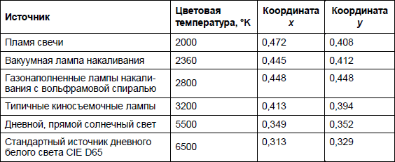 Ахроматическая точка на диаграмме может считаться белой только условно. Ее фактический оттенок и местоположение зависит от источника света, выбранного для синтеза цвета, или от источника освещения. Координаты этой точки однозначно определяются цветовой температурой источника. Цветовая температура – это характеристика интенсивности излучения источника света (табл. 1.3.1). Ее значение равняется температуре нагрева абсолютно черного тела, при которой последнее испускает излучение с той же цветностью, что и измеряемый источник.