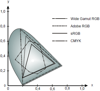 В практических целях цветовая диаграмма xyY применяется для сравнения цветовых охватов устройств ввода и вывода с локусом и между собой. Для этого внутри локуса выбираются точки, соответствующие выбранным для аддитивного синтеза цвета базовым цветам. После соединения их отрезками прямых получается геометрическая фигура, представляющая цветовой охват устройства. На рис. 1.3.14 изображены цветовые охваты стандартных цветовых пространств RGB и полиграфического процесса цветной офсетной печати.