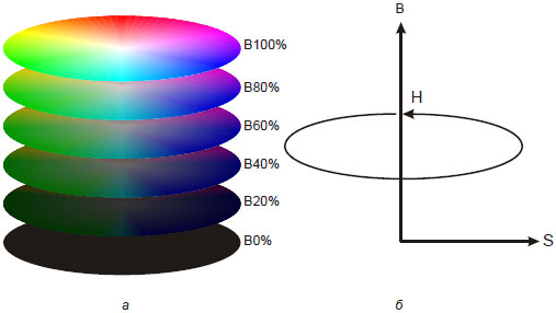 Рис. 1.3.15. Цветовое пространство цветовой модели HSB: а – сечения цветового пространства, соответствующие фиксированным значениям яркости; б – устройство системы цветовых координат
