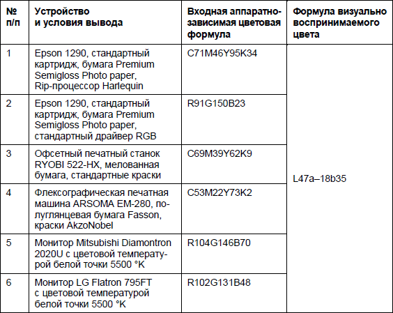 Таблица 1.3.2. Условия отображения цвета на различных устройствах графического вывода