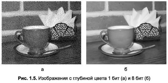 Глубина цвета указывает, какой объем информации о цвете каждого пикселя доступен для отображения и печати. В изображении с большей глубиной цвета может присутствовать на порядок большее количество цветов (рис. 1.5).