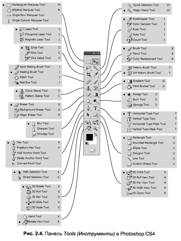 Инструменты, которые не видны на панели, сгруппированы с аналогичными инструментами. Черный треугольник в правом нижнем углу кнопки инструмента указывает на наличие этого скрытого списка. Чтобы увидеть весь список инструментов, представленных в данной группе, нужно навести указатель мыши на требуемую пиктограмму и некоторое время удерживать нажатой левую кнопку мыши (на рис. 2.4 отображены все наборы скрытых инструментов).
