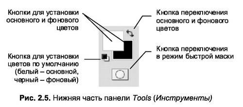 Кроме доступа к инструментам, панель Tools (Инструменты) также предоставляет некоторые другие возможности, кнопки для которых расположены в нижней части панели (рис. 2.5).