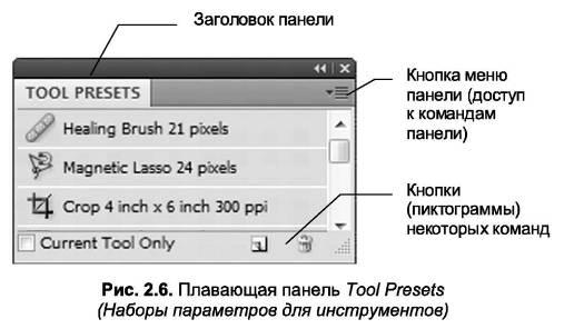 Панели выполнены в виде миниатюрных окон со стандартными кнопками для сворачивания и закрытия в верхней части (если панель не закреплена в доке), как на рис. 2.6. В правом верхнем углу каждой из них расположена кнопка меню панели