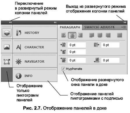 Панели можно располагать на экране по собственному усмотрению, объединять в группы, просто перетаскивая мышью за заголовки и закреплять. Для закрепления панелей предусмотрено пространство в левой части окна (док). В нем панели могут отображаться в виде пиктограмм, пиктограмм с подписью или в развернутом виде. Располагаться в доке панели могут как в один, так и в несколько столбцов (рис. 2.7).
