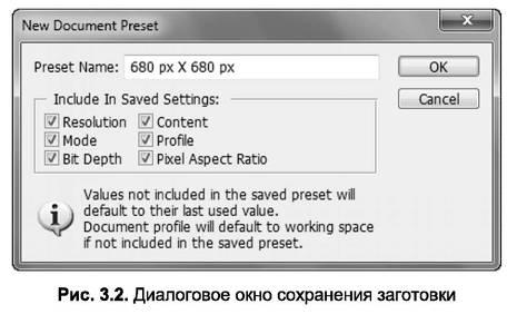 Кнопка Save Preset (Сохранить заготовку), расположенная в правой части окна, предназначена для создания пользовательского формата, который может быть использован в дальнейшем. Диалоговое окно этой команды (рис. 3.2) позволяет задать название формата, а также выбрать настройки, включаемые в данный формат: Resolution (Разрешение), Mode (Цветовая модель), Bit Depth (Глубина цвета), Content (Содержимое), Profile (Цветовой профиль), Pixel Aspect Ratio (Вид пикселей).