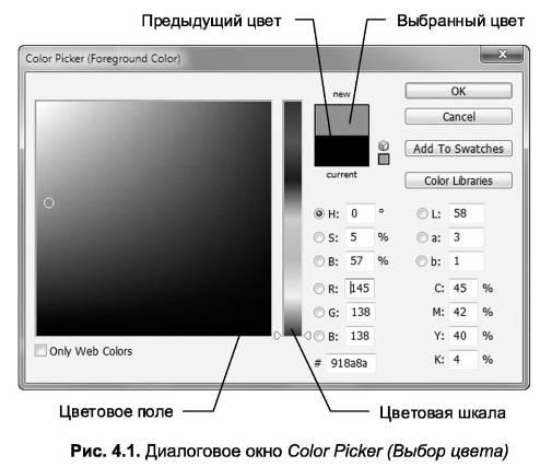 Выбрать цвет можно несколькими способами. Двойной щелчок мыши по образцу цвета на панели инструментов откроет диалоговое окно Color Picker (Выбор цвета), в котором можно выбрать цвет щелчком по цветовому полю или задать точные цветовые координаты в одной из цветовых моделей (рис. 4.1).