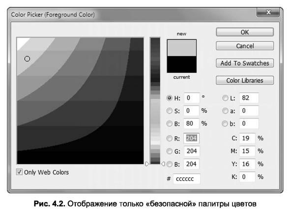 В нижней части диалогового окна находится флажок Only Web Colors (Только цвета Web). Если его включить, на цветовом поле будут отображены только цвета, доступные для «безопасной» палитры Web (рис. 4.2). В поле шестнадцатеричного представления цвета, помеченного значком «#», можно ввести соответствующее числовое значения цвета, используемое в Web.