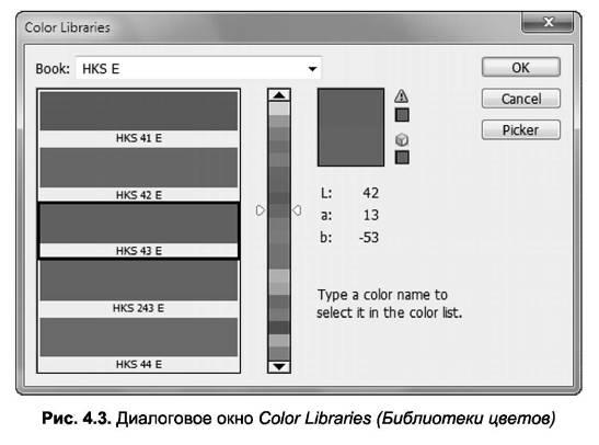 При необходимости воспользоваться библиотеками (заготовками) плашечных цветов нужно щелкнуть по кнопке Color Libraries (Библиотеки цветов). В результате отобразится одноименное диалоговое окно, в котором открывается доступ к библиотекам плашечных цветов (рис. 4.3).