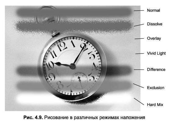 На панели Options (Параметры) также задается режим смешивания (или режим наложения) Mode (Режим), определяющий взаимодействие кисти и части изображения, на котором применяется инструмент. Режимы наложения и понятие слоя подробно описаны в главе 6 «Работа со слоями». На рис. 4.9 показаны примеры использования разных режимов наложения.