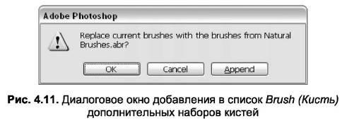 При выборе в списке набора кистей появляется окно сообщения (рис. 4.11), с помощью которого можно заменить выбранным набором уже имеющиеся в палитре кисти (нажав кнопку ОК) или добавить кисти, входящие в набор, к существующему списку доступных кистей (используя кнопку Append (Присоединить)).