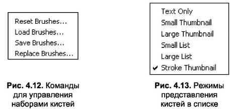 Среди команд меню также присутствуют команды, позволяющие сохранять пользовательские наборы кистей (Save Brushes), загружать дополнительные наборы (Load Brushes), заменять существующий набор на выбранный (Replace Brushes) или возвращаться к набору по умолчанию (Reset Brushes) (рис. 4.12).