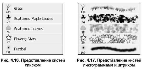 Stroke Thumbnail (Миниатюра мазка) – в списке будут отображены пиктограмма кисти и образец применения кисти, как на рис. 4.17 (этот режим отображения выбран на рис. 4.8).