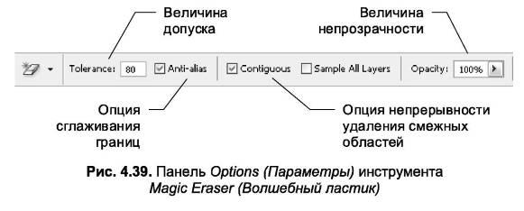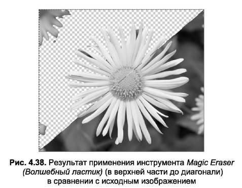 Magic Eraser (Волшебный ластик) предназначен для быстрого удаления близких по цвету пикселей изображения (рис. 4.38). По сути, инструмент является комбинацией двух действий – выделения при помощи инструмента Magic Wand (Волшебная кисть) (его возможности детально рассмотрены в следующей главе) и очистки выделенной области.
