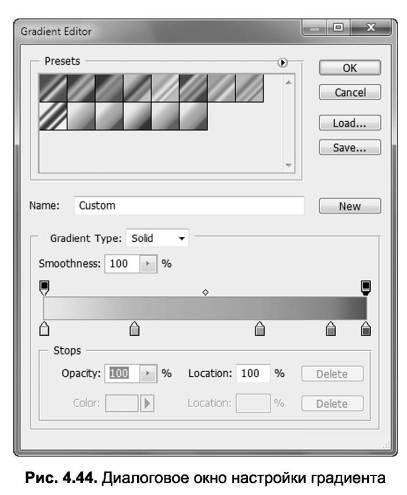 Для редактирования существующих градиентов и создания новых используется диалоговое окно Gradient Editor (Редактор градиентов) (рис. 4.44), для вызова которого нужно один раз щелкнуть на текущем образце градиента на панели Options (Параметры).