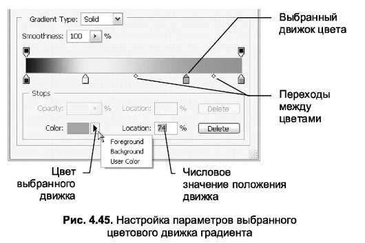 При выделении движка по обеим сторонам от него появляются небольшие ромбики, которые определяют переход между соседними цветами (рис. 4.45). Перемещая их мышью или вводя значения в поле Location (Положение) (перед вводом значений ромбик необходимо выделить), можно сдвигать границу цветового перехода, а также делать ее плавной или резкой. В качестве 50 % при этом принимается положение, равноудаленное от соседних цветовых движков.