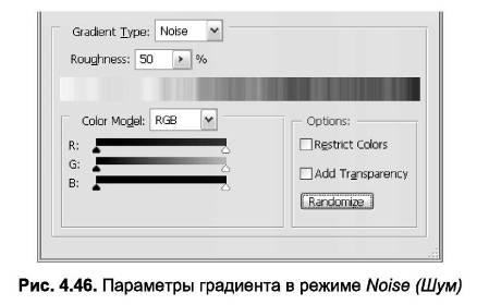 Градиенты данного типа состоят из случайно распределенных цветов указанного диапазона. Диапазон указывается в области Color Mode (Цветовая модель) и может быть дополнительно ограничен расположенными ниже движками (рис. 4.46). Параметр Roughness (Резкость) задает степень резкости границ между цветовыми переходами.