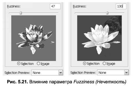 Одним из важных отличий команды является наличие диалогового окна, с возможностью предварительного просмотра и выполнения дополнительной настройки параметров для получения оптимального результата (рис. 5.20). Цветовой допуск, определяющий количество пикселей, подлежащих выделению, может плавно регулироваться при помощи движка Fuzziness (Нечеткость) в диалоговом окне, причем все изменения в нем отображаются сразу же (рис. 5.21).