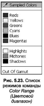 Остальные режимы осуществляют выделение определенных цветовых оттенков: красных (Reds), желтых (Yellows), зеленых (Greens), голубых (Cyans), синих (Blues) или пурпурных (Magentas), а также позволяют выделить света (Highlights), тени (Shadows) и средние тона (Midtones) в изображении (рис. 5.23).