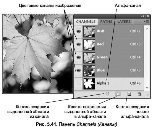 в нижней части панели Channels (Каналы) или воспользоваться командой Save Selection (Сохранить выделение) меню Select (Выделение), позволяющей дополнительно задать некоторые параметры. В результате в панели Channels (Каналы) будет создан новый канал, в котором белым цветом будут представлены выделенные области изображения, а черным – маскированные (рис. 5.41).