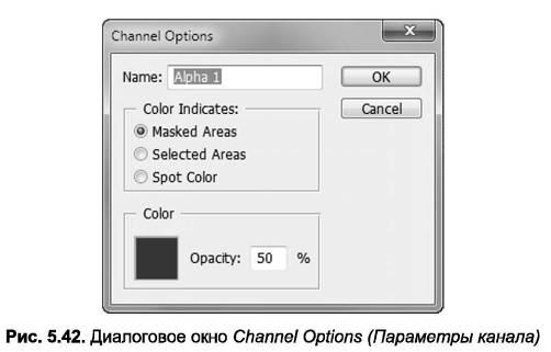 По умолчанию новому альфа-каналу присваивается имя Alpha 1 (2, 3…), но его можно изменить на более информативное, дважды щелкнув по нему в панели Channels (Каналы). В результате появится диалоговое окно Channel Options (Параметры канала) (рис. 5.42), в котором можно присвоить каналу новое имя, а также определить, какие области будут обозначаться цветом – маскированные (Masked Areas) или выделенные {Selected Areas). Переключатель Spot Color (Плашечный цвет) позволяет назначить каналу определенный плашечный цвет.