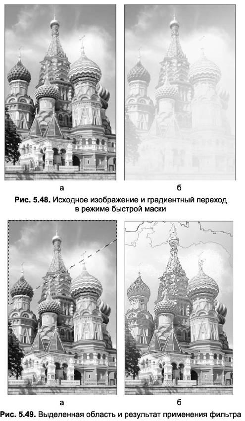 С помощью масок можно легко получить плавные переходы. Используя инструмент Gradient (Градиент), можно создать плавный переход в режиме быстрой маски и затем применить по этой маске какой-либо эффект к изображению на слое (рис. 5.48).