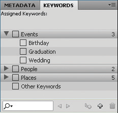 Ключевые слова для фотографии задаются на панели Keywords (Ключевые слова) (рис. 1.9). На этой панели уже присутствуют группы, включающие определенные ключевые слова. Например, в группе Events (События) содержатся ключевые слова «Birthday» («День рождения»), «Graduation» («Выпускной») и «Wedding» («Свадьба»). Таким образом, чтобы, например, пометить фотографию как свадебную, достаточно выделить ее эскиз и установить флажок слева от ключевого слова «Wedding». Даже ничего не надо вводить.