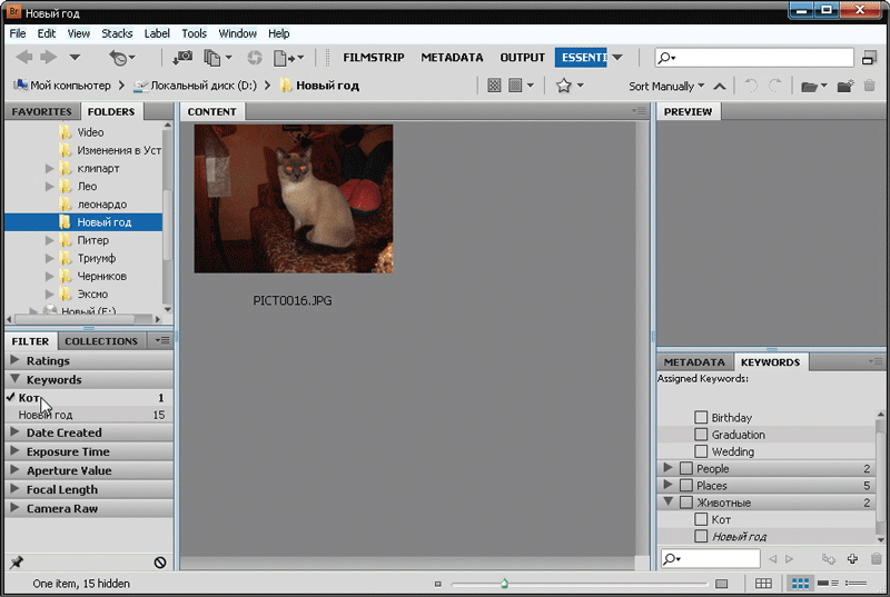 Ключевые слова, как и рейтинг, можно задавать не только фотографиям, но и видеороликам, документам, векторным рисункам (иными словами, любым файлам). В дальнейшем при отборе документов по ключевому слову «жираф», например, вы можете найти не только фотографии, но и видеофильмы, музыку и другие документы, ассоциированные с ним. В этом и заключается удобство работы с программой Bridge: это не просто организатор фотографий, но и полноценный файловый менеджер с возможностями, намного превосходящими обычный проводник Windows.