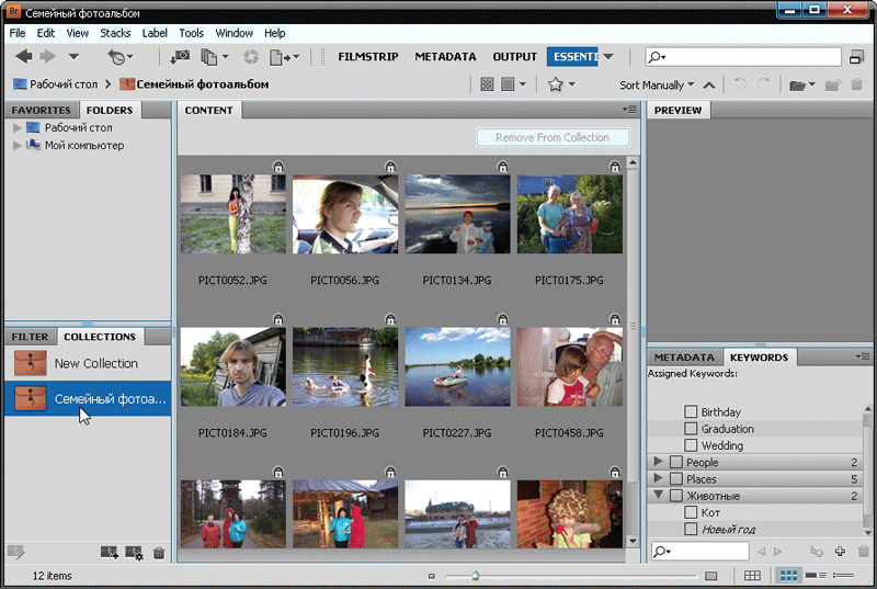 Еще один удобный инструмент для организации фотографий (и других файлов) – создание коллекций. Представьте, что вы складываете фотографии в фотоальбом. Таких фотоальбомов у вас несколько. В одном оказываются семейные фотографии, в другом – фотографии, снятые в отпуске, в третьем – снимки с вечеринок и т. д. Коллекции представляют собой виртуальные фотоальбомы, в которые можно «сложить» самые разные снимки. В дальнейшем, открыв ту или иную коллекцию, вы отобразите на панели Content фотографии, хранящиеся в данной коллекции. Самое главное удобство коллекции в том, что в нее можно складывать файлы из разных папок и дисков. То есть вам не придется «перетряхивать» все папки на компьютере в поисках нужной фотографии. Вы будете точно знать, что она хранится в определенной коллекции, а место расположения фотографии значения не имеет.