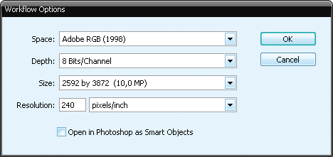 В нижней части окна Camera RAW (прямо под областью просмотра) расположена ссылка, с помощью которой вызывается диалоговое окно Workflow Options (Свойства рабочего пространства) для выбора рабочего пространства (рис. 2.3).
