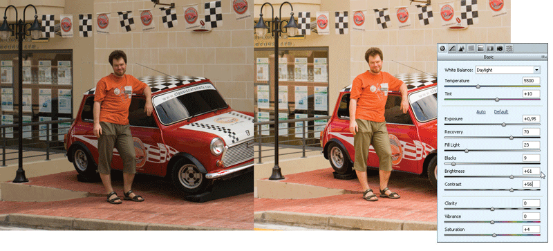 В верхней части вкладки Basic расположен раскрывающийся список White Balance (Баланс белого). В этом списке присутствуют такие пункты, как Auto (Авто), Daylight (Дневное освещение), Cloudy (Облачно), Shade (Тень), Tungsten (Пасмурно), Fluorescent (Люминесцентное освещение), Flash (Вспышка), Custom (Вручную). Нетрудно догадаться, что, например, для устранения цветовых искажений в результате съемки в пасмурную погоду надо выбрать пункт Tungsten. Остальные пункты выбираются так же, в зависимости от условий съемки. В ряде случаев этого бывает достаточно, чтобы восстановить естественность цветов на снимке (рис. 2.4).