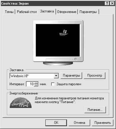 На вкладке Заставка (содержимое данной вкладки изображено на рис. 1.13) осуществляется выбор изображения (как правило, движущегося), запуск которого осуществляется системой автоматически после простоя компьютера в течение некоторого промежутка времени. Этот промежуток задается в поле Интервал.