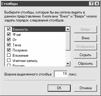 Команда Вид?Столбцы предназначена для настройки отображения столбцов в списке почтовых сообщений (в каждом столбце указывается соответствующий реквизит почтового сообщения). При выполнении данной команды на экране отображается окно, изображенное на рис. 2.3.