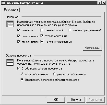 В выделенной области Область просмотра осуществляется настройка отображения области просмотра почтовых корреспонденций. По умолчанию область просмотра располагается в правой нижней части интерфейса, под списком почтовых сообщений. Чтобы отключить отображение области просмотра, следует сбросить флажок Отображать область просмотра. Если же данный флажок установлен, то становятся доступными еще несколько параметров. С их помощью определяется месторасположение области просмотра (под сообщениями либо рядом с сообщениями), и осуществляется управление отображением заголовка области просмотра (флажок Отображать заголовок области просмотра, по умолчанию установлен).