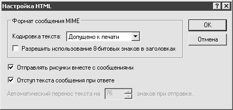 В верхней части данного окна находится выделенная область Формат сообщения MIME, в которой определяется способ кодировки. Начинающим пользователям не рекомендуется изменять параметры, расположенные в этой области, а оставить предложенные по умолчанию.