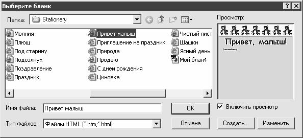 В левой части данного окна содержится перечень имеющихся бланков, в правой части (поле Просмотр) – показывается образец бланка, на котором установлен курсор в левой части. Например, на рис. 2.8 курсором выделен бланк Привет малыш, и его образец демонстрируется в поле Просмотр.