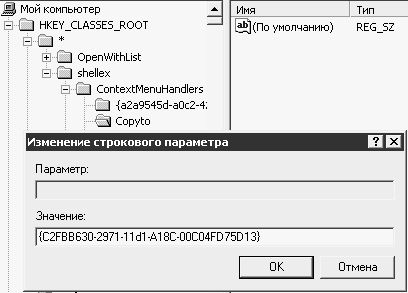 Для того, чтобы включить функцию Копировать в папку в локальное меню Проводника, необходимо в разделе системного реестра HKEY_CLASSES_ROOT*shellexContextMenuHandlers создать подраздел Copyto и присвоить параметру По умолчанию значение {C2FBB630–2971–11d1–A18C-00C04FD75D13} (см. рис. 2.5).