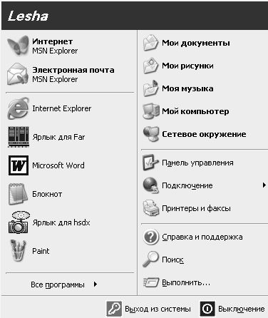 После выполнения указанных действий и последующей перезагрузки компьютера функция Недавние документы исчезнет из меню кнопки Пуск (рис. 2.13).