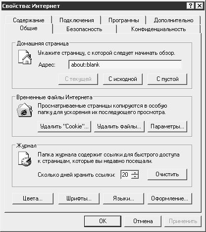 Переход в режим просмотра и редактирования свойств интернет–обозревателя осуществляется с помощью функции Пуск?Панель управления?Свойства обозревателя либо при выполнении функции Сервис?Свойства обозревателя, вызываемой в окне интернет–обозревателя. В любом случае на экране открывается окно Свойства: Интернет, изображенное на рис. 2.41.