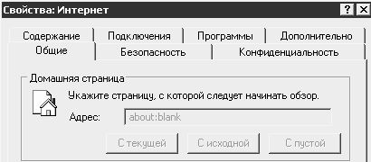 В верхней части вкладки Общие находится группа параметров Домашняя страница (рис. 2.41). При необходимости закрыть доступ к данным параметрам нужно в разделе реестра HKEY_CURRENT_USERSoftwarePoliciesMicrosoftInternet ExplorerControl Panel создать параметр HomePage типа DWORD и присвоить ему значение 1, см. ниже текст соответствующего reg–файла.