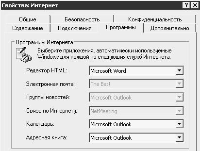 В соответствующих полях группы параметров Программы Интернета выбираются приложения, автоматически используемые Windows для некоторых служб Интернета. Возможности системного реестра позволяют запрещать/разрешать редактирование этих полей.