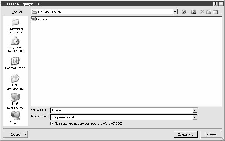 Если в данном окне в поле Тип файла указано одно из следующих значений: Документ Word, Документ Word с поддержкой макросов, Шаблон Word или Шаблон Word с поддержкой макросов, то под этим полем появляется флажок Поддерживать совместимость с Word 97-2003. Если этот флажок установлен, то документ, сохраненный в каком-либо из перечисленных форматов, будет совместим с форматом Word версий с 1997 по 2003.