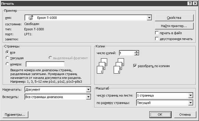 В поле Включить указывается, какую часть документа требуется вывести на печать: Все страницы диапазона, Нечетные страницы или Четные страницы. Данное поле доступно для редактирования только в том случае, если в расположенном выше поле Напечатать установлено значение Документ.