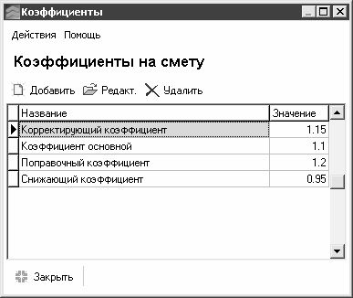 При активизации команды Справочники?Коэффициенты на смету на экране открывается окно справочника, изображенное на рис. 1.15.