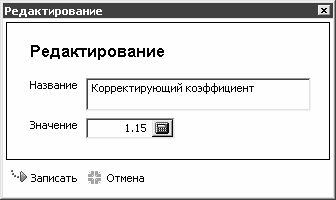 В данном окне в поле Название следует ввести название коэффициента, кратко отражающее его суть. В поле Значение с клавиатуры либо с помощью календаря, открываемом по кнопке выбора, вводится конкретное числовое значение коэффициента. Это значение должно быть введено в десятичном формате (например, значение 1,3 в процентном выражении будет соответствовать 30 %).
