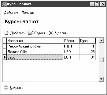 Для перехода в режим работы со справочником валют следует выполнить команду Справочники?Курсы валют – в результате на экране откроется окно справочника, которое представлено на рис. 1.17.