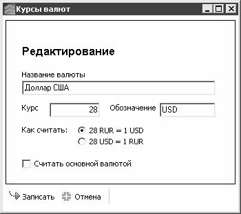 Завершается процесс ввода и редактирования валюты нажатием в данном окне кнопки Записать. С помощью кнопки Отмена осуществляется выход из данного режима без сохранения выполненных изменений.