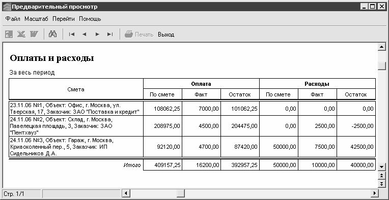 В данном разделе мы рассмотрим достаточно интересный и полезный отчет – отчет по оплатам и расходам. Смысл его заключается в том, что в одном документе представлена сводная информация обо всех поступивших оплатах по всем сметам, и обо всех дополнительных расходах по всем сметам. Иначе говоря, в данном отчете аккумулируется сводная информация по всем сметам, которая хранится в окнах ввода и редактирования смет на вкладках Расходы и Оплата (см. рис. 1.30 и 1.32).