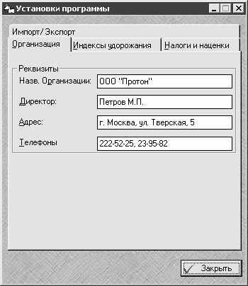 На вкладке Импорт/Экспорт в соответствующих полях с клавиатуры указываются имена файлов, используемых при импорте и экспорте данных.